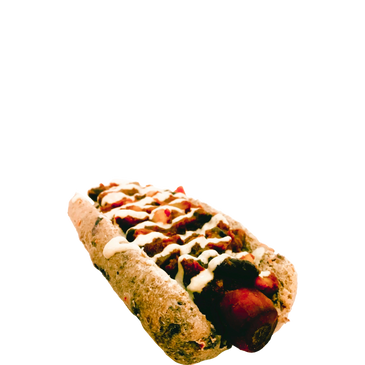 roasted carrot dog loaded with homemade chili, and drizzled with nooch sauce